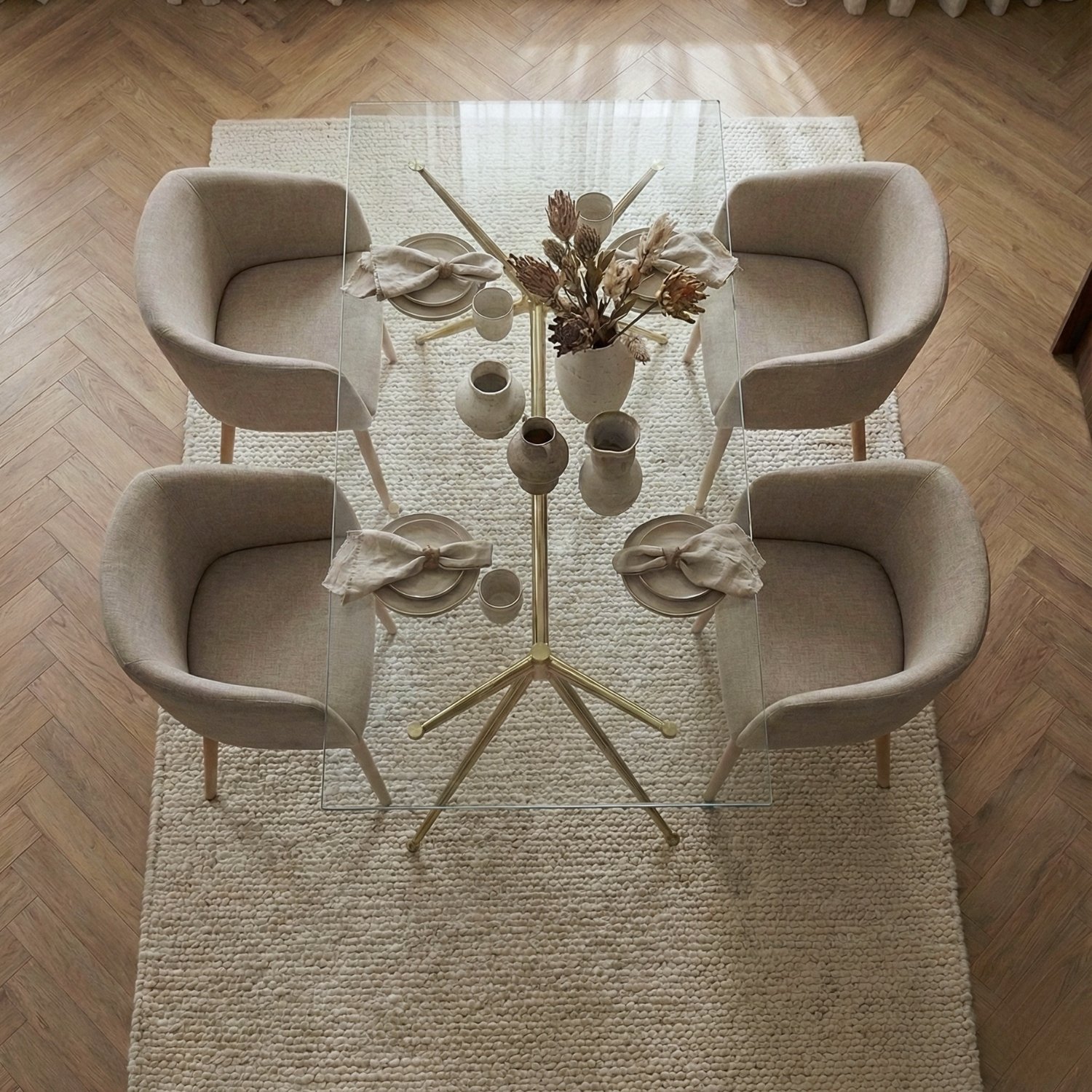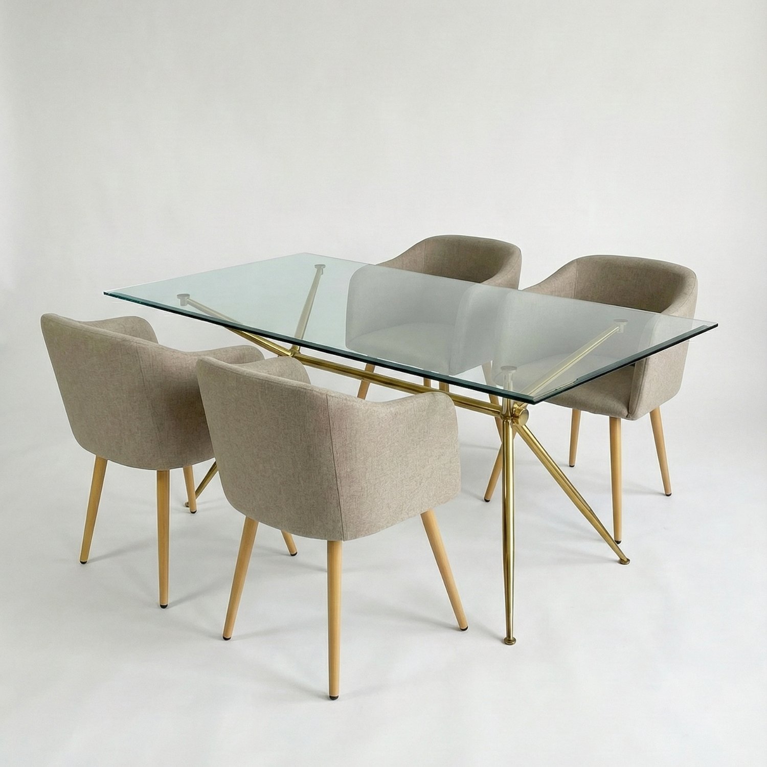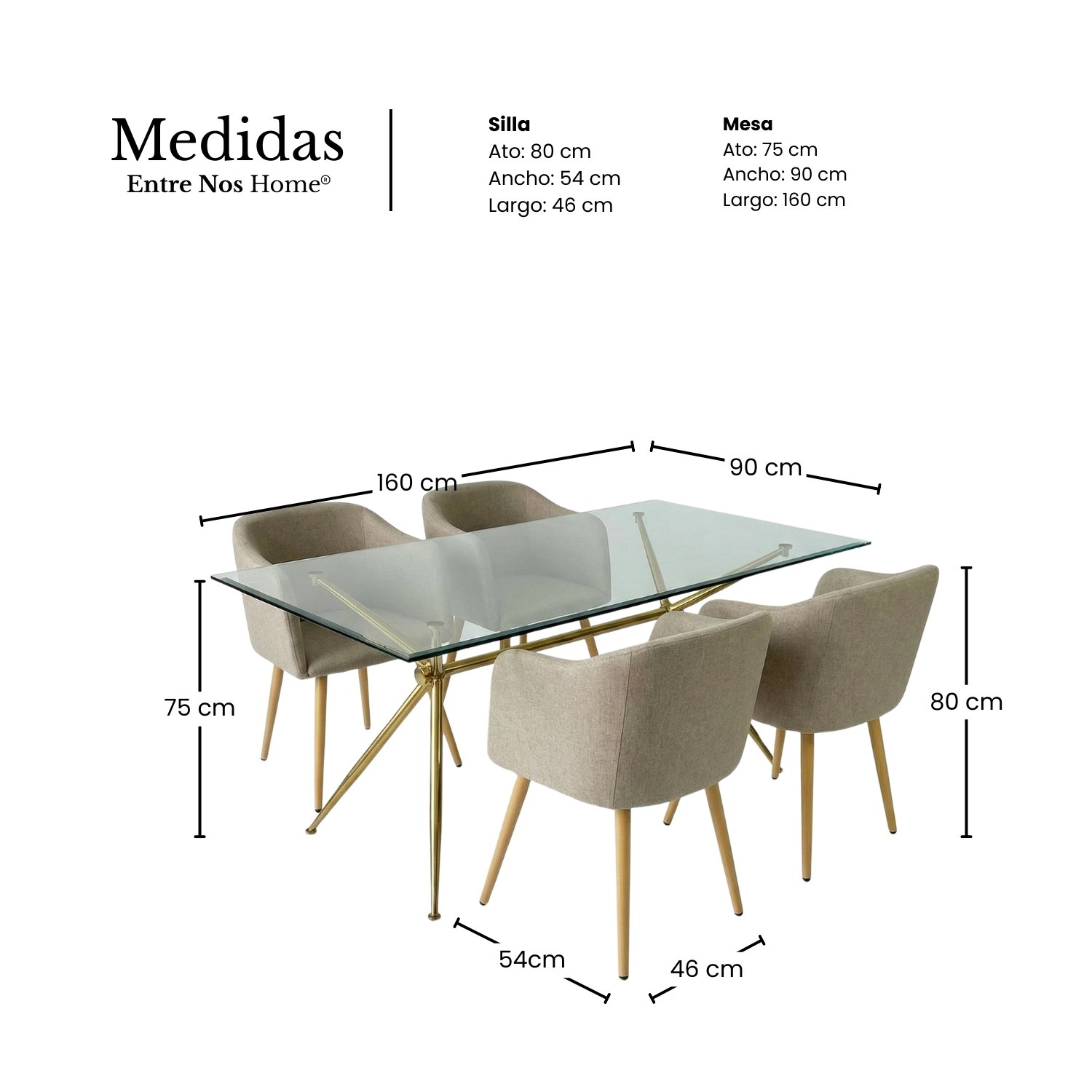 Acompañando esta pieza, las cuatro Sillas Ámbar en color beige ofrecen una experiencia sensorial única. El tapizado en tela de alta calidad suaviza el ambiente y aporta la comodidad necesaria para largas sobremesas. Cada material ha sido seleccionado para crear un entorno “lived-in” que se siente real, elegante y acogedor, convirtiendo tu comedor en un espacio de revista donde la funcionalidad y la belleza conviven en perfecta armonía.