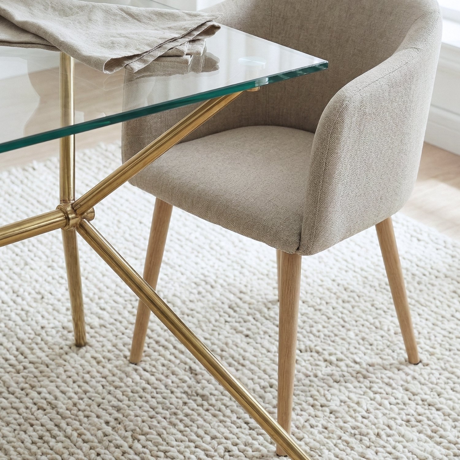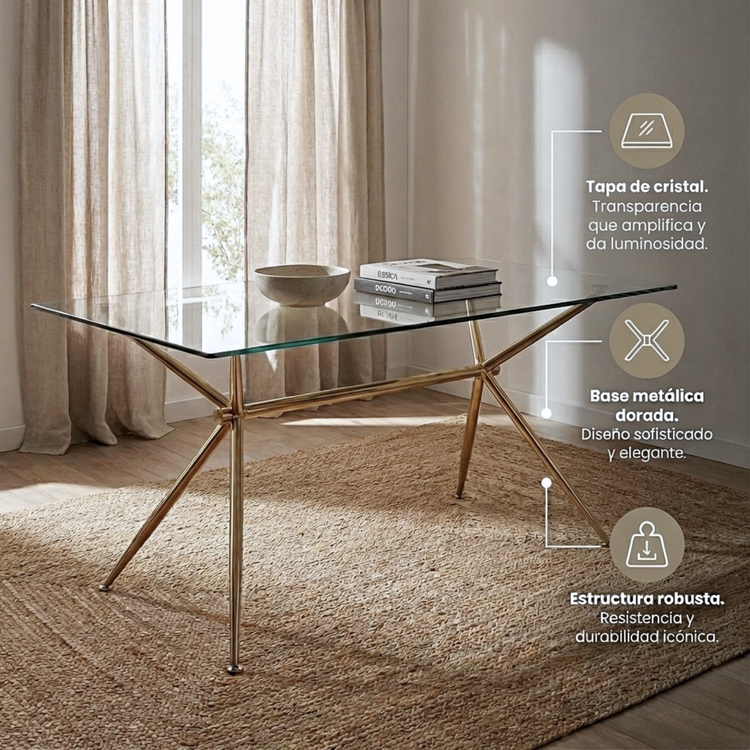 - Mesa Brie: Tapa de cristal templado con base metálica en acabado dorado mate.