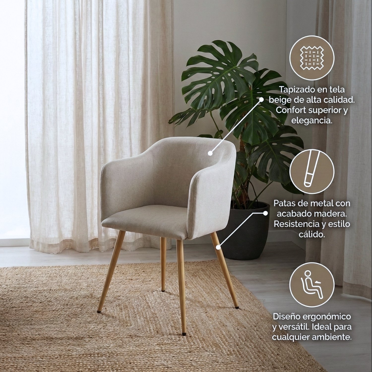 - Sillas Ámbar: Tapizado en tela beige de alta calidad con diseño ergonómico.