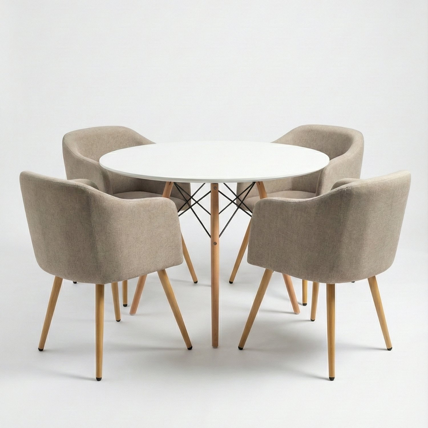 - Configuración: 1 Mesa Redonda Blanca + 4 Sillas Ámbar Beige.