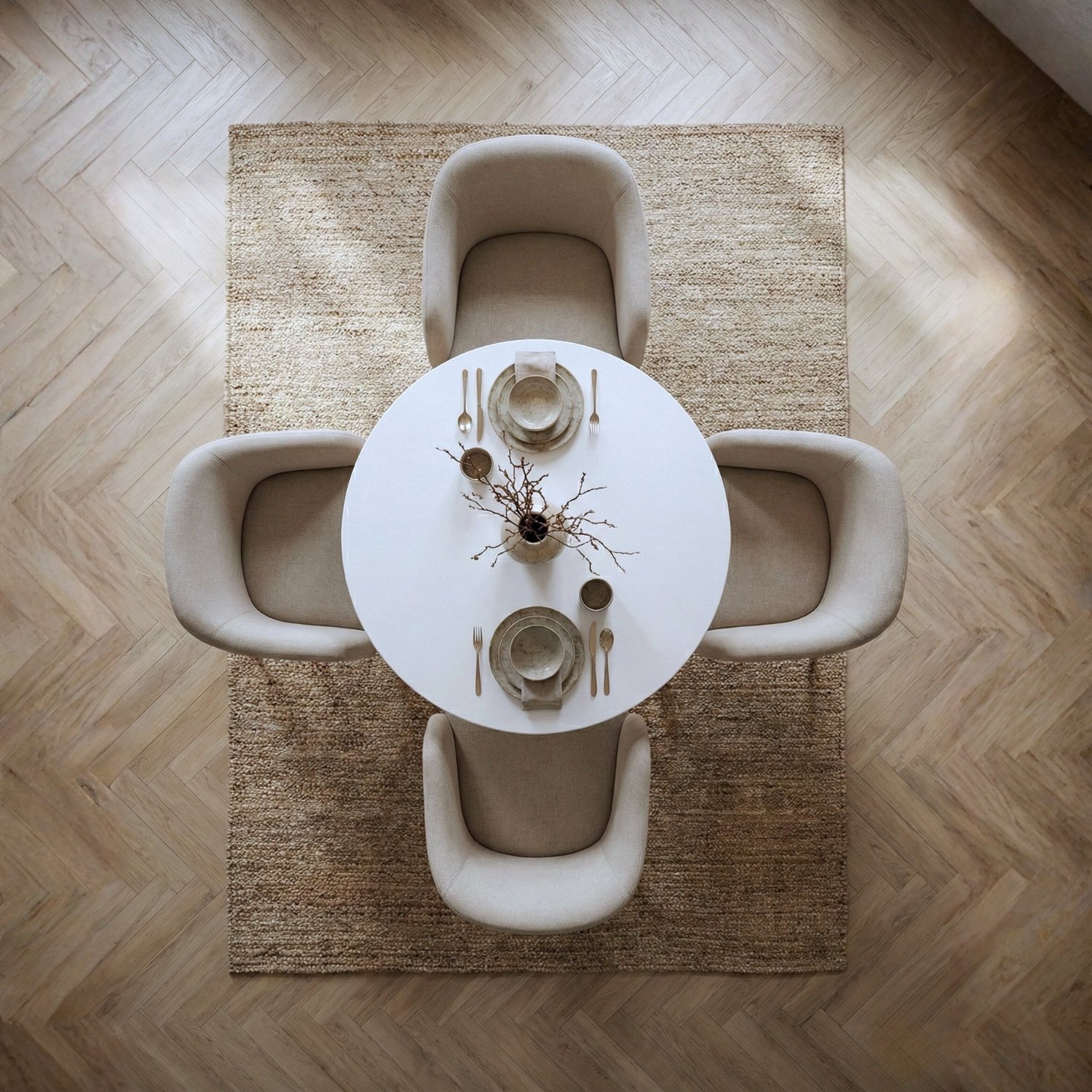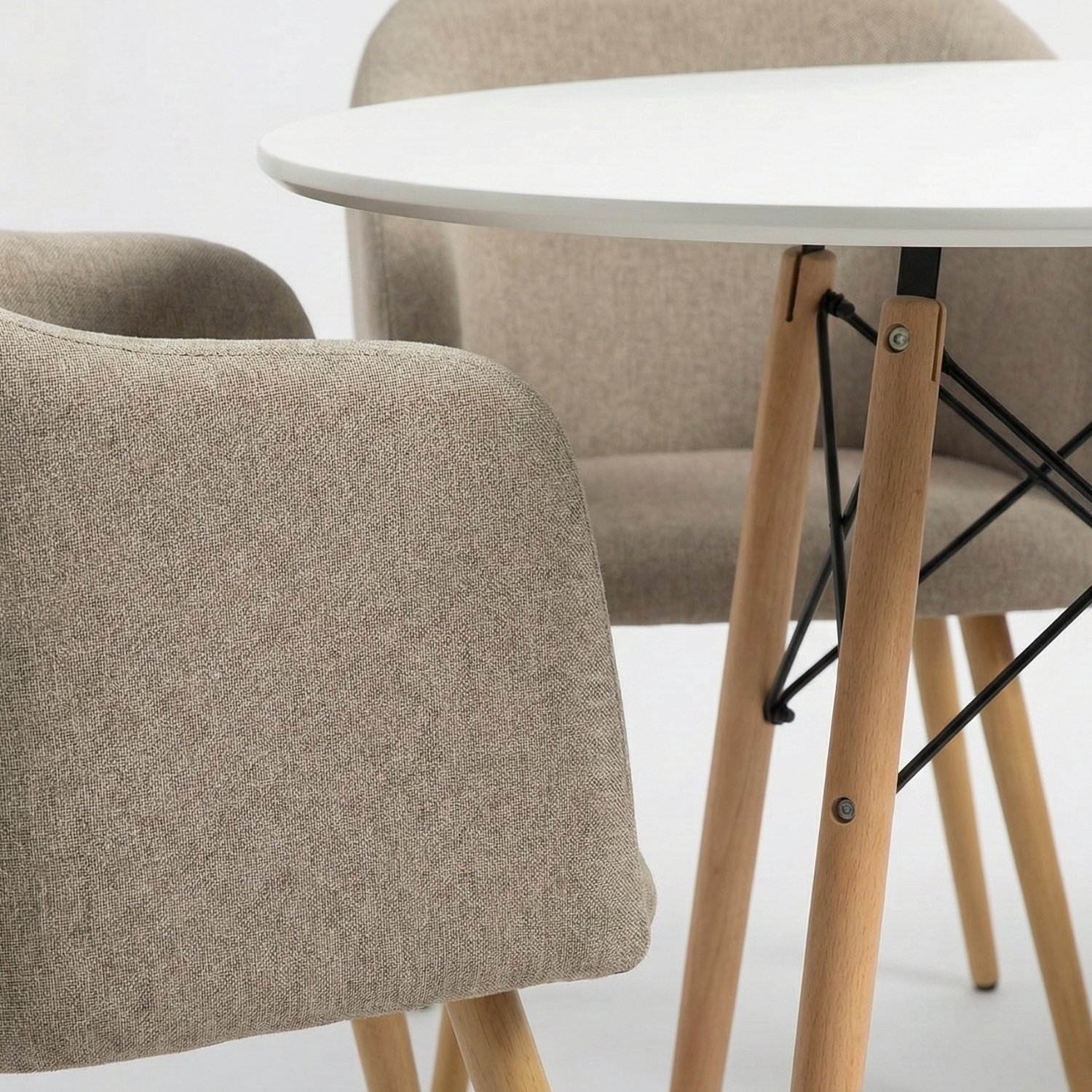 La riqueza de este set reside en su paleta monocromática cálida y su mezcla de texturas suaves: desde la superficie lisa y luminosa de la mesa hasta el tejido premium de las sillas y la calidez natural de las patas de madera de arce. Cada elemento ha sido seleccionado para proyectar un estilo de vida sereno, donde la funcionalidad del día a día se fusiona con un diseño icónico que invita a disfrutar de cada encuentro en un entorno de calma total y distinción minimalista.