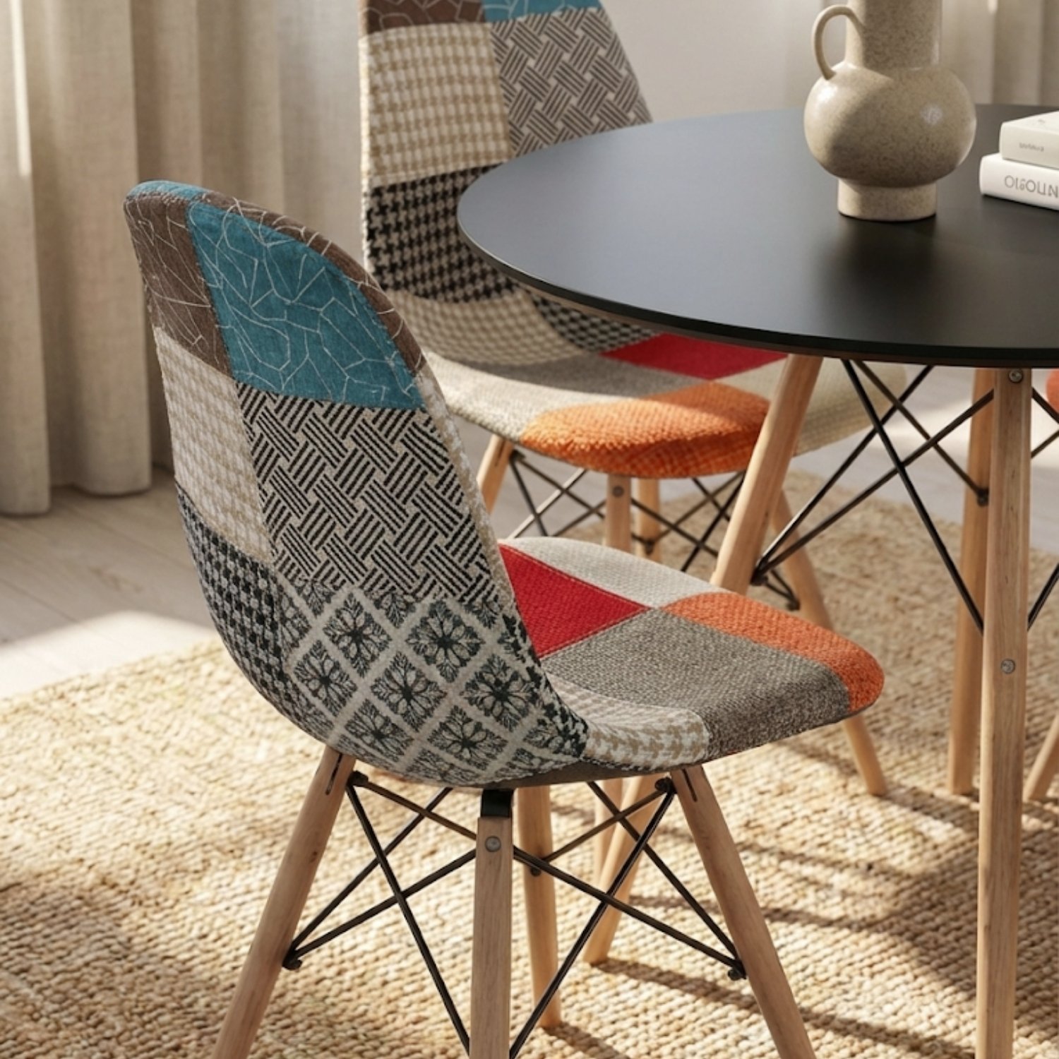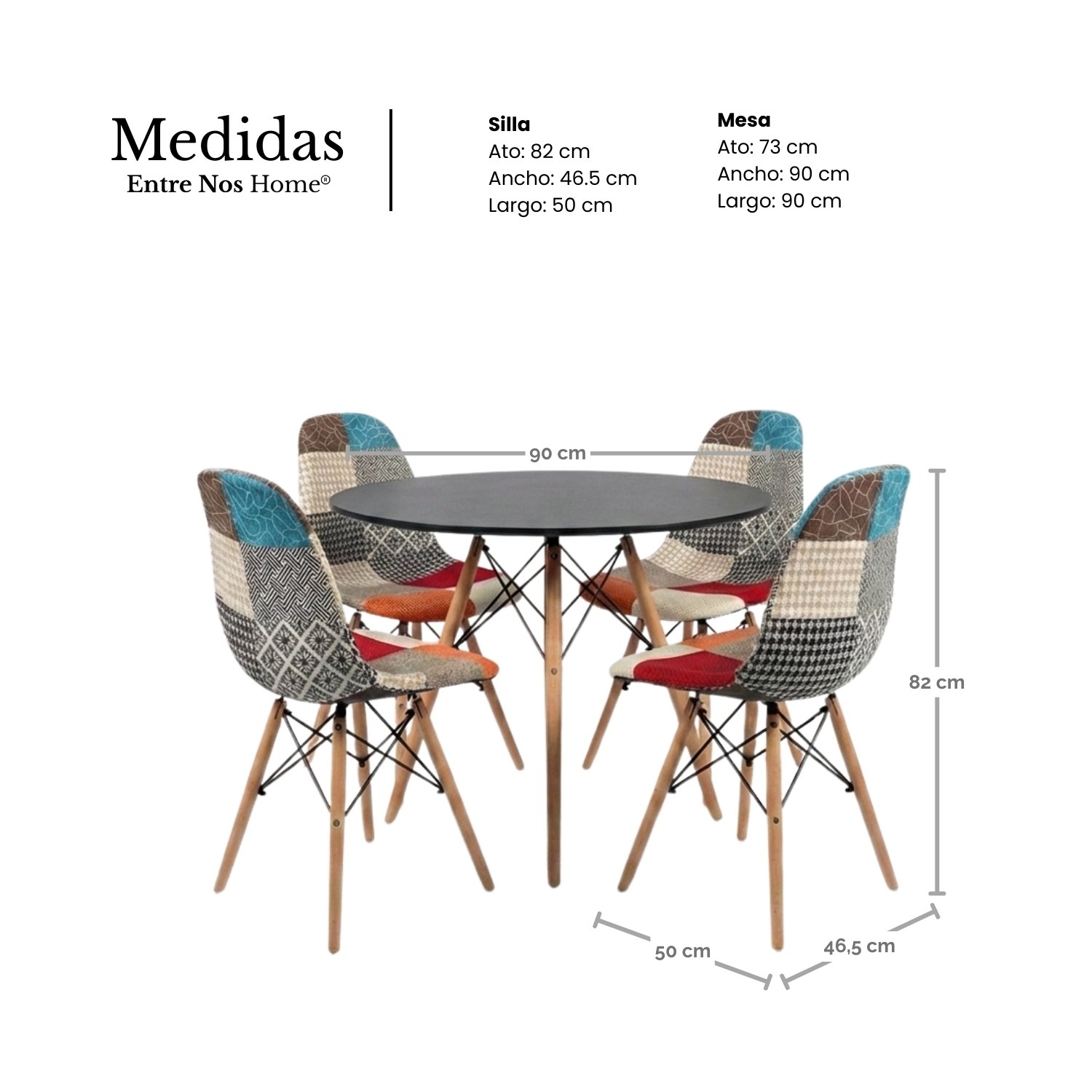 - Material Sillas: Tapizado patchwork premium con patas en madera de haya y base metálica.