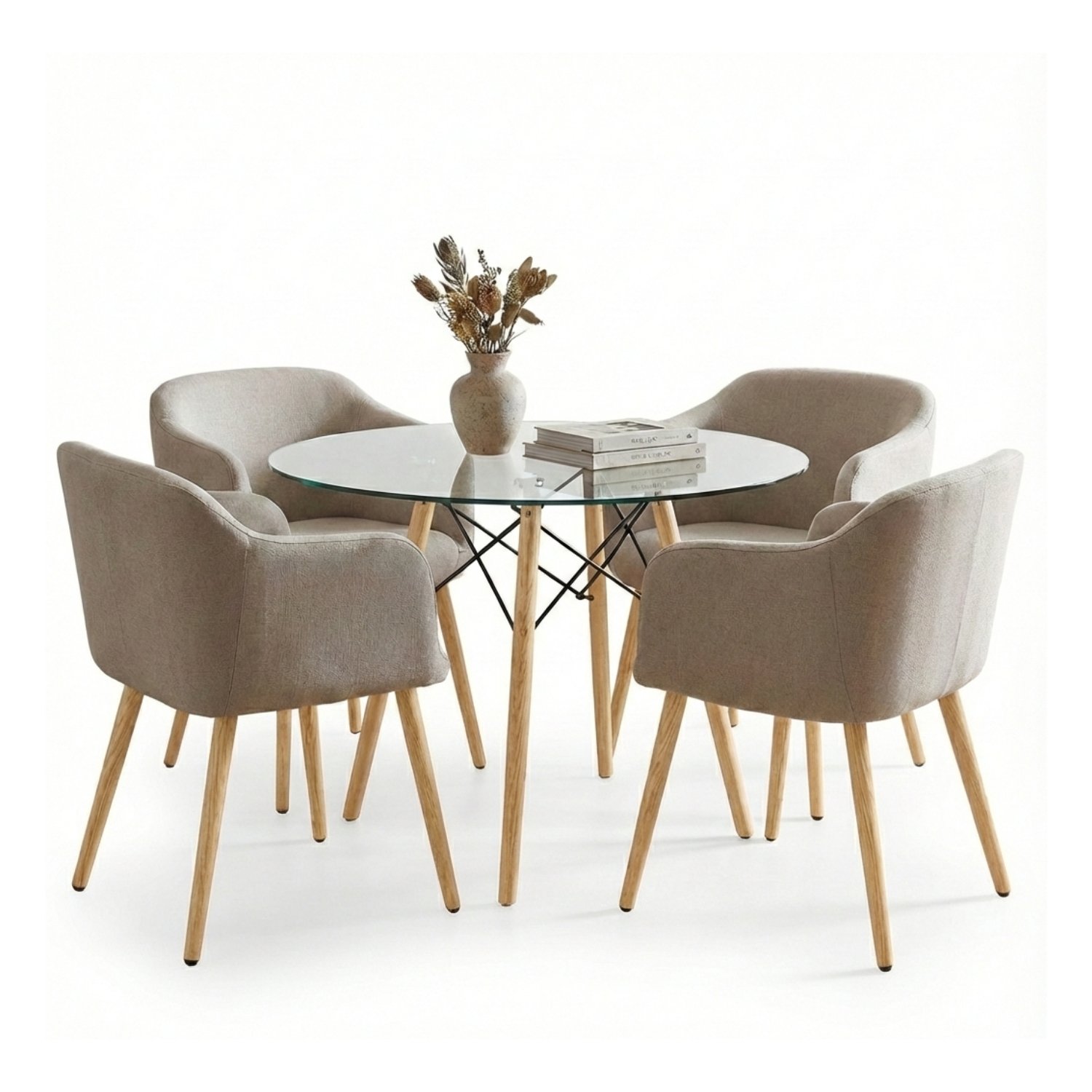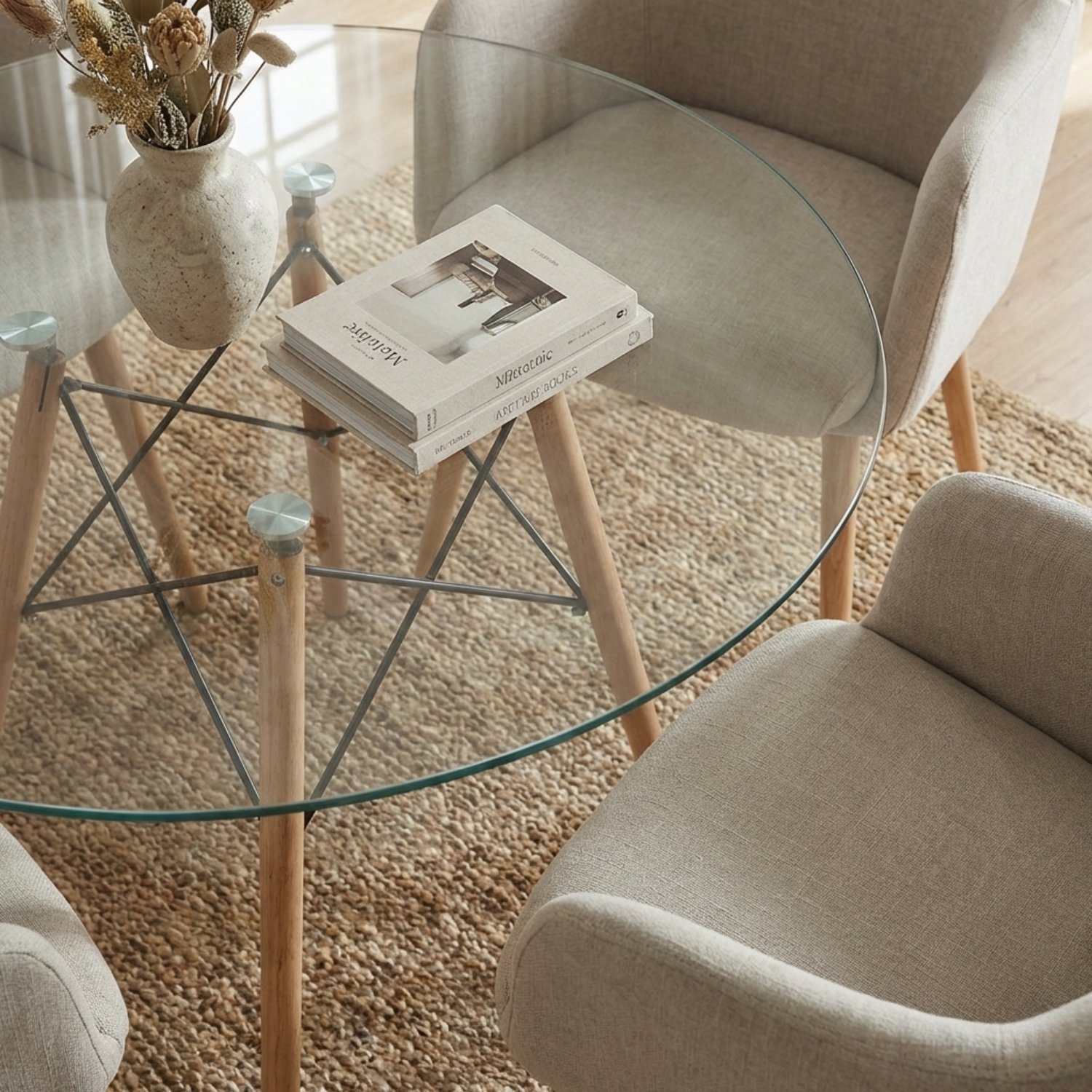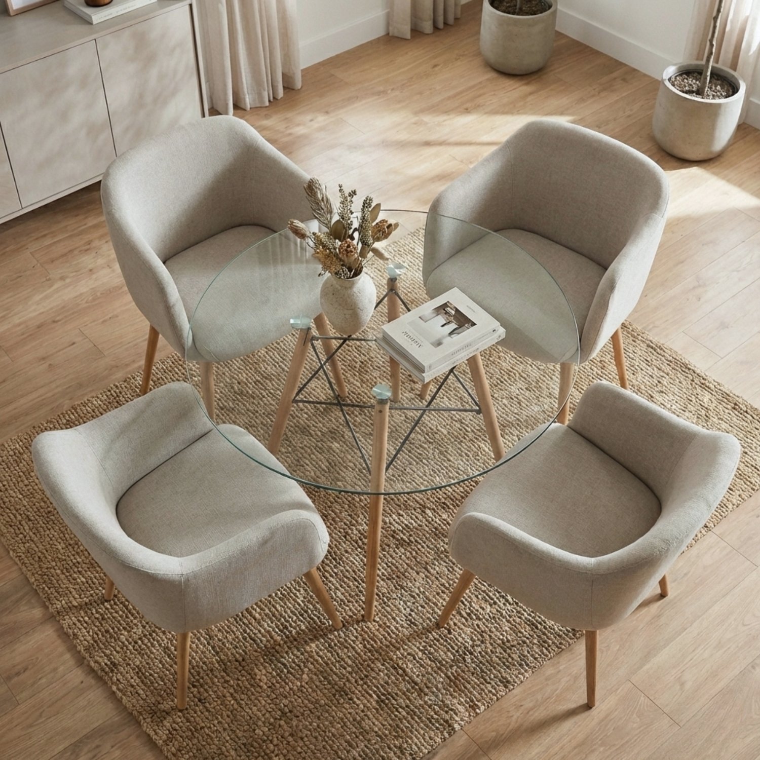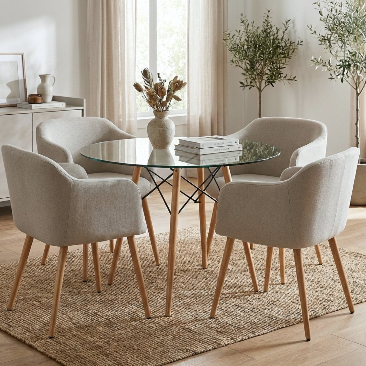 - Configuración: 1 Mesa Redonda de Vidrio + 4 Sillas Ámbar Tapizadas.