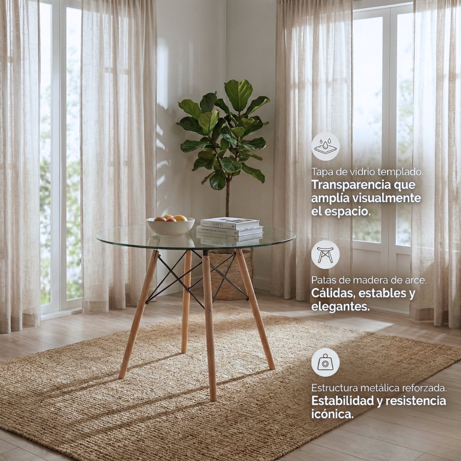 La mesa de vidrio templado actúa como un espejo de luz natural, maximizando visualmente el área disponible. Es la opción ideal para apartamentos urbanos o comedores de concepto abierto que requieren una estética limpia.