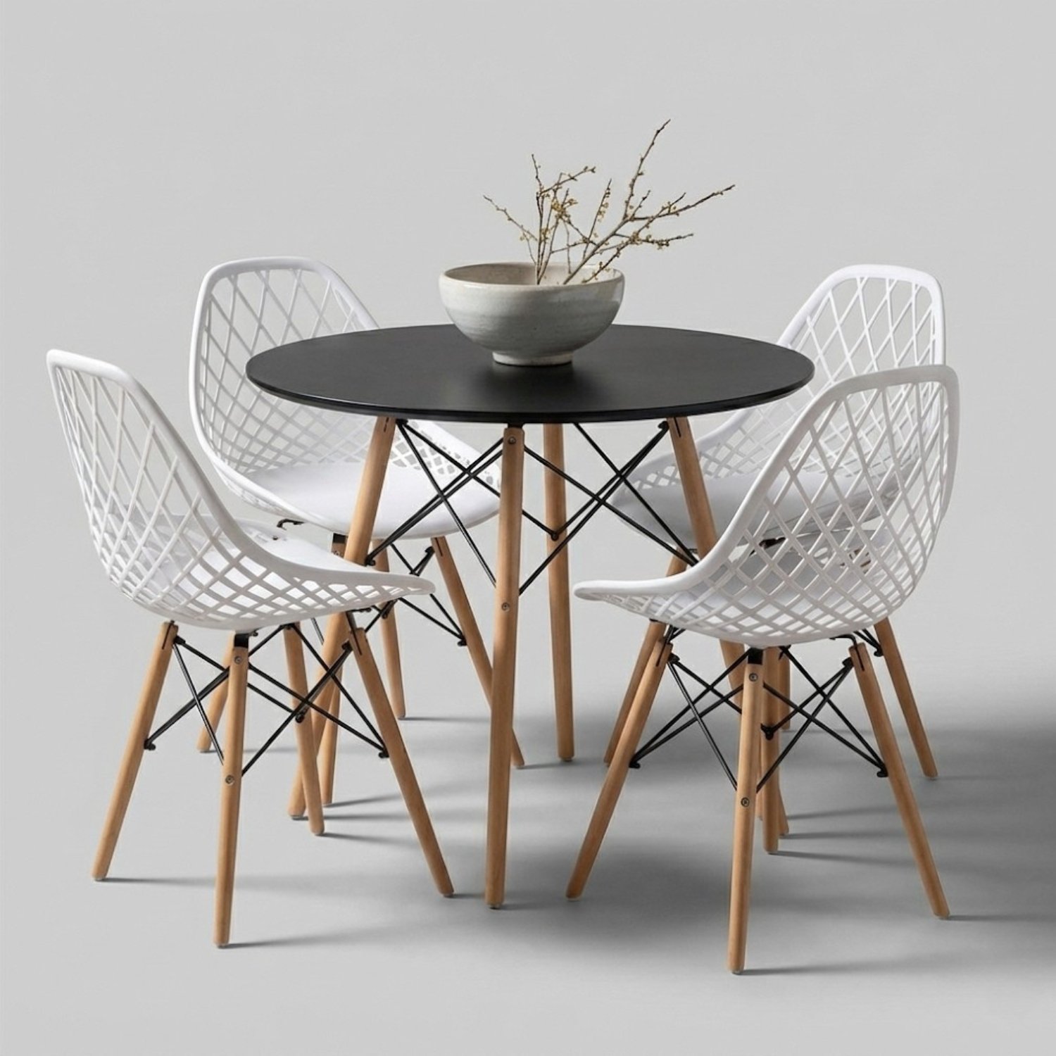 • Incluye: 4 sillas blancas + 1 mesa negra redonda