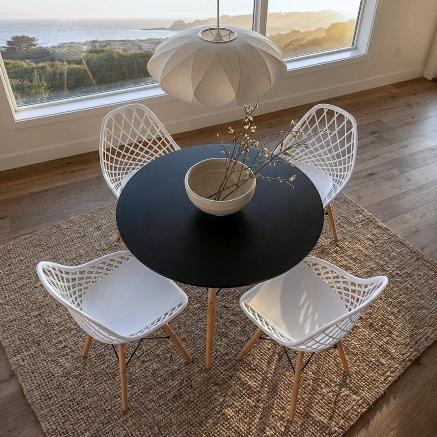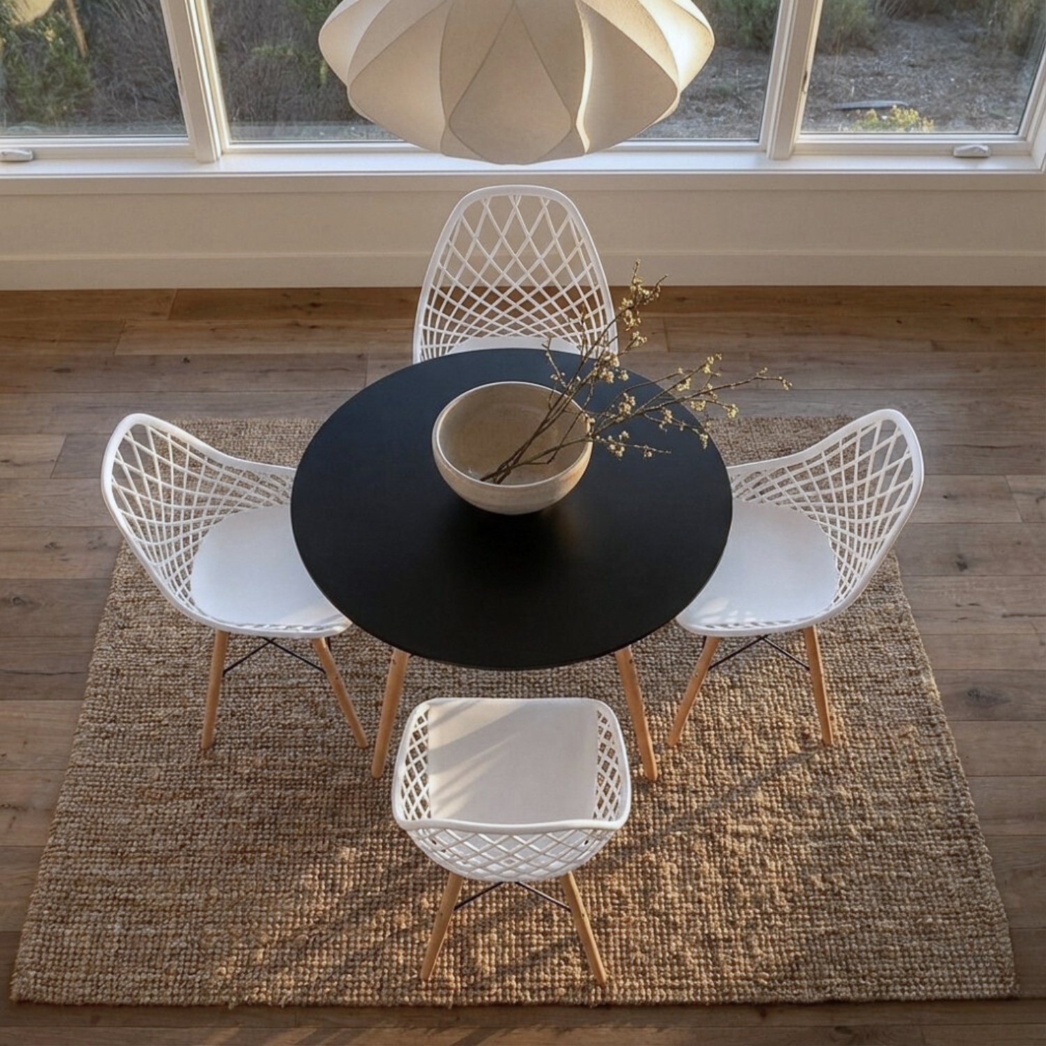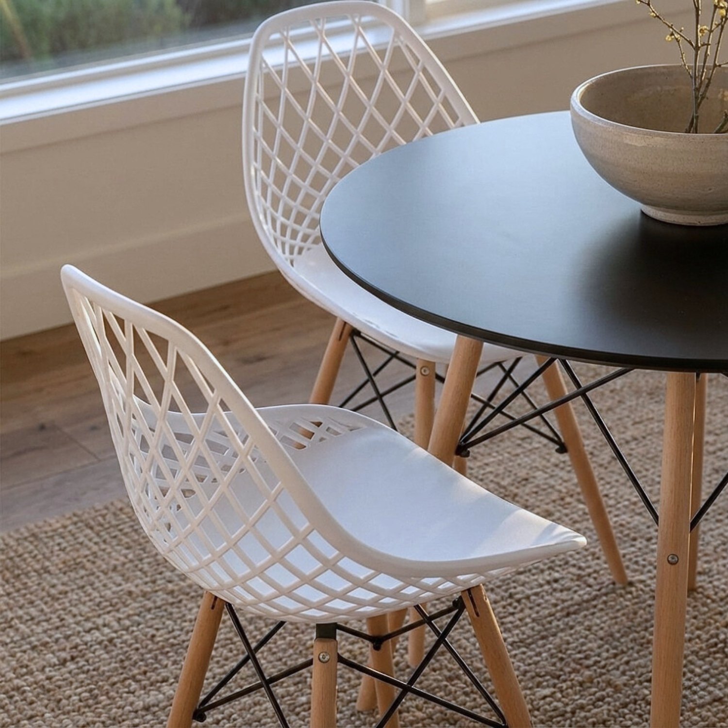 La combinación atemporal de mesa negra con sillas blancas crea un punto focal sofisticado. Perfecto para espacios modernos, minimalistas o escandinavos que buscan personalidad y un impacto visual inmediato.