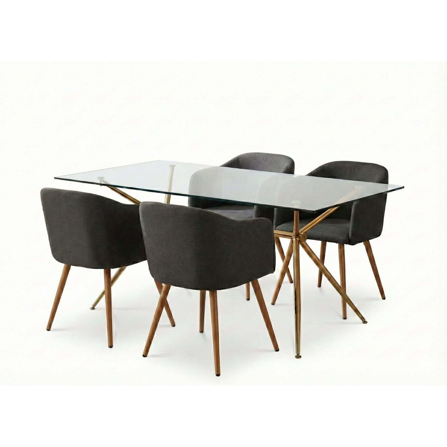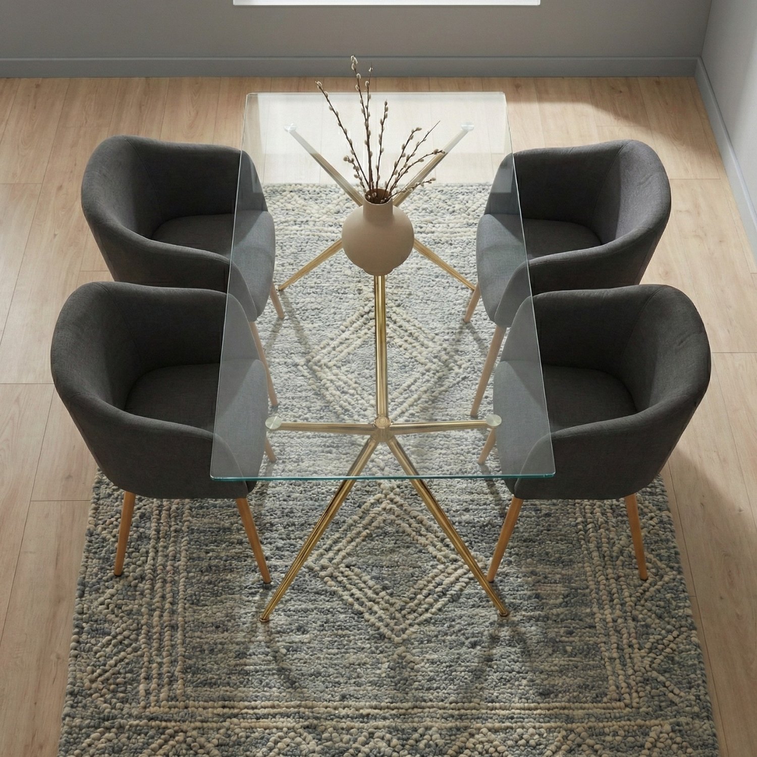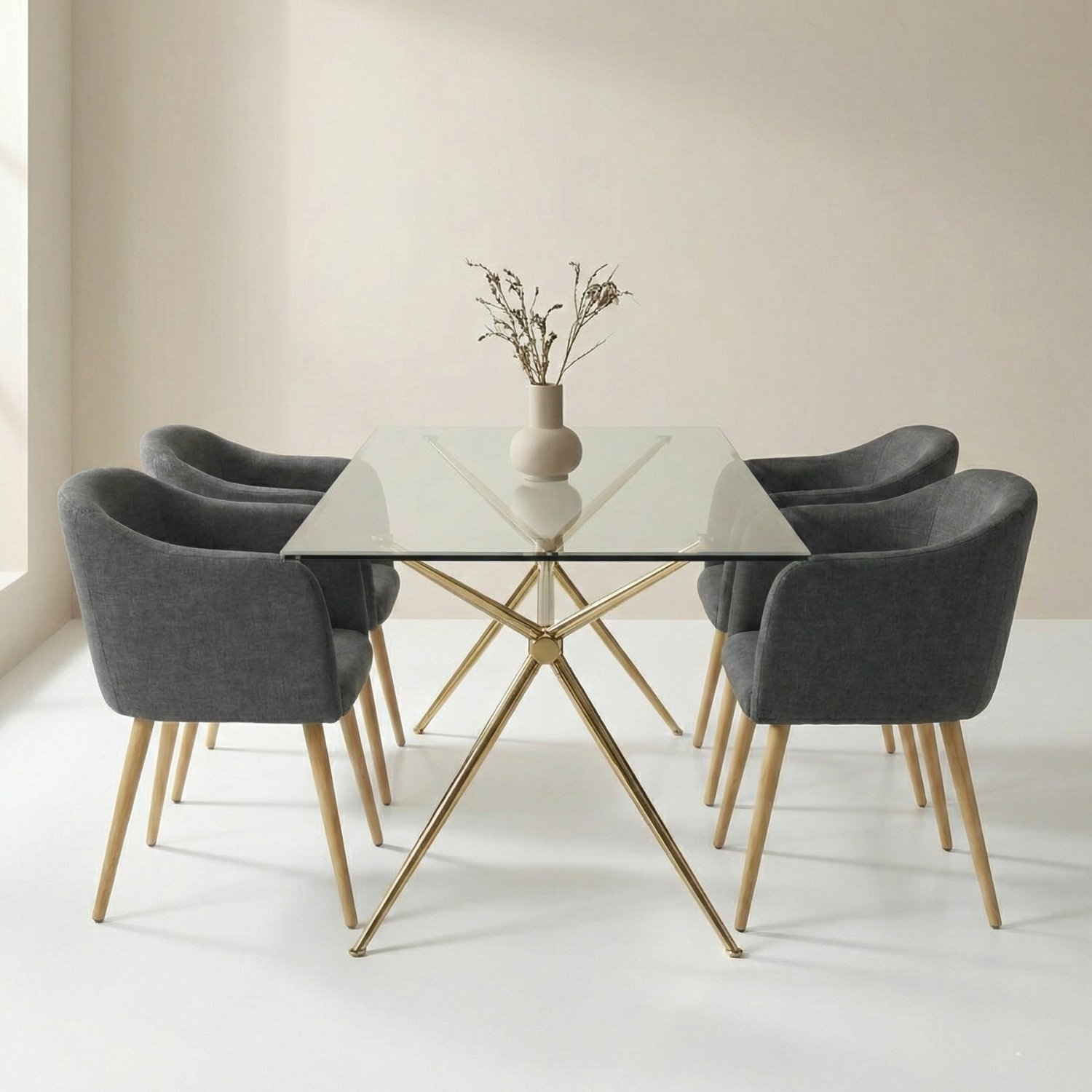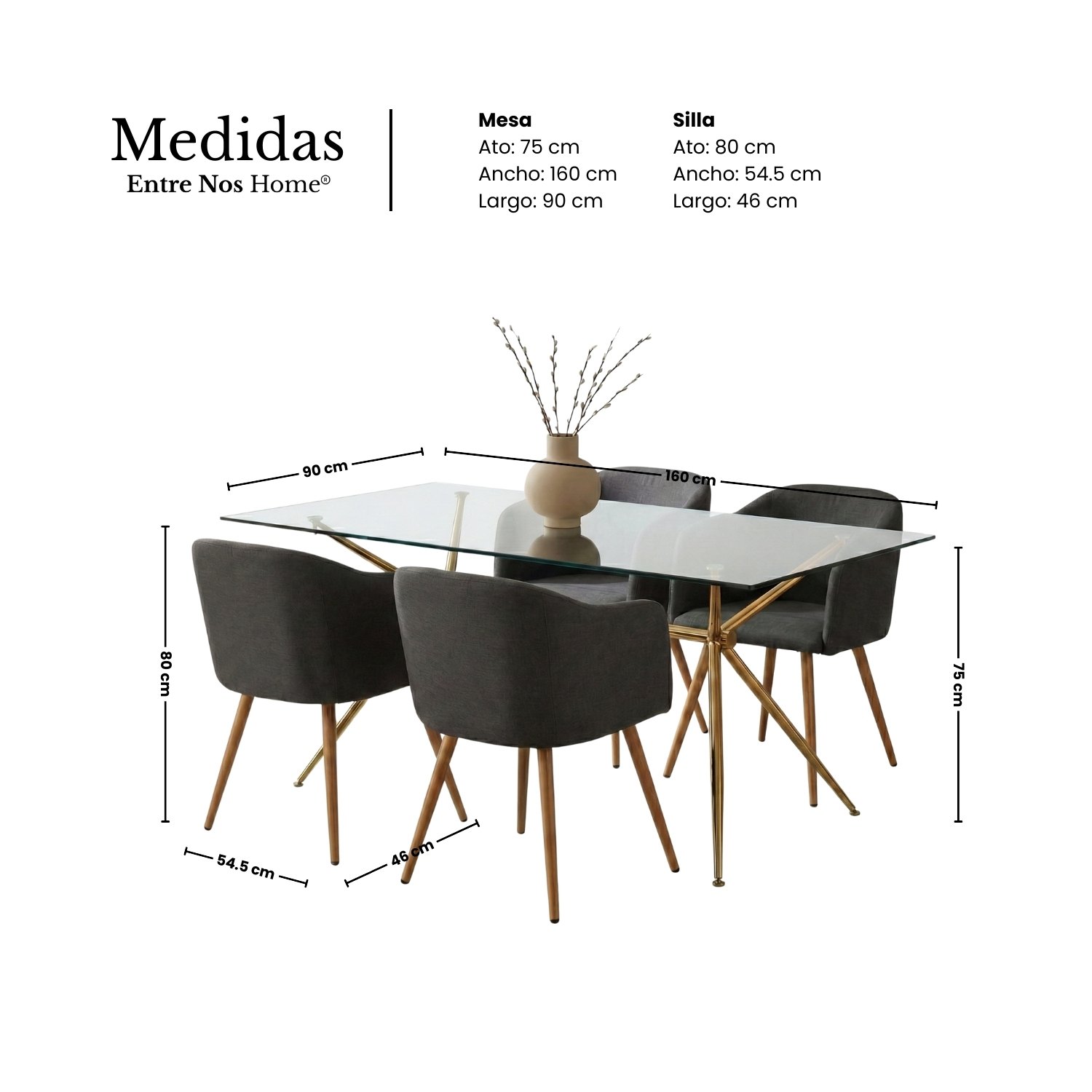 • Configuración: 1 Mesa Brie (Vidrio) + 4 Sillas Tapizadas Grises.