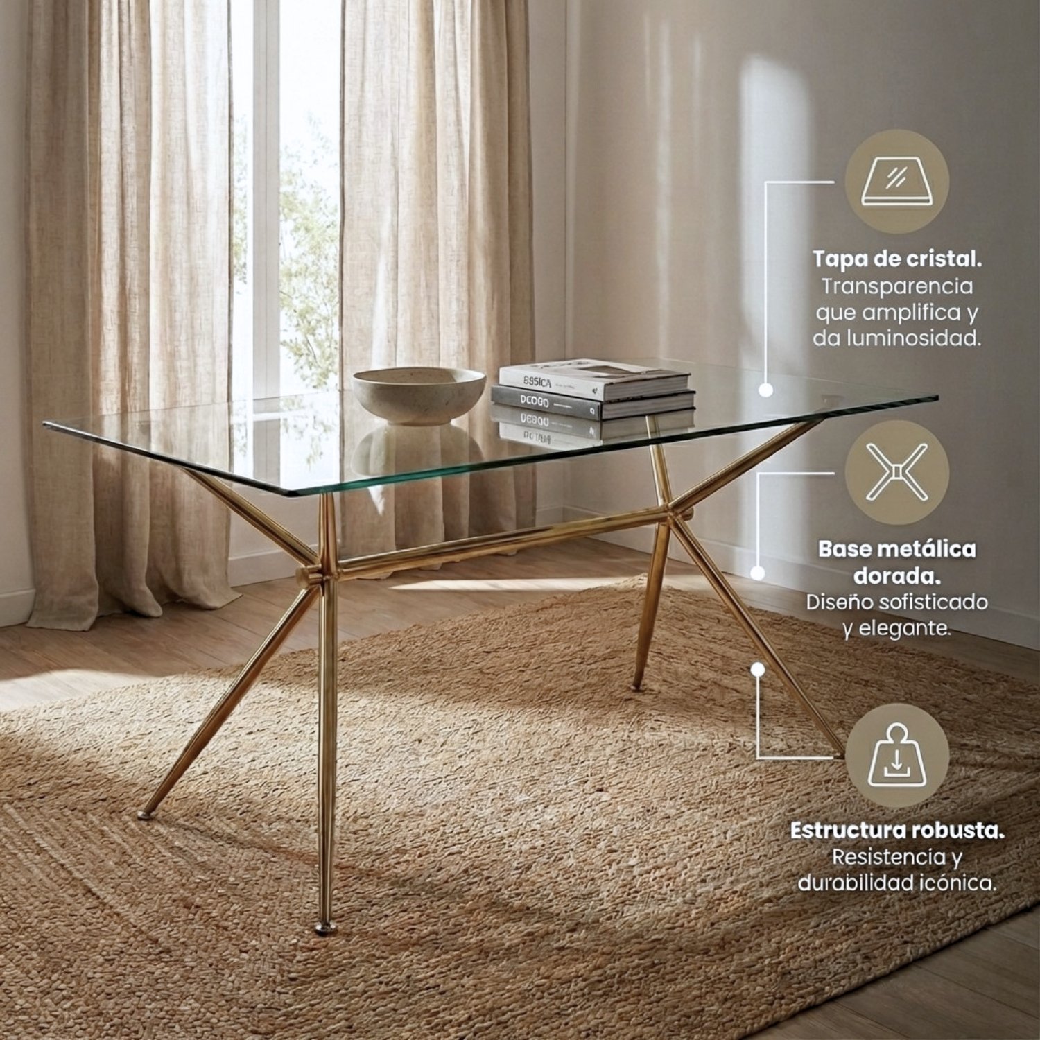 • Mesa Brie: Tapa de vidrio templado (160 cm x 90 cm) y base escultural metálica dorada (Alto: 75 cm).
