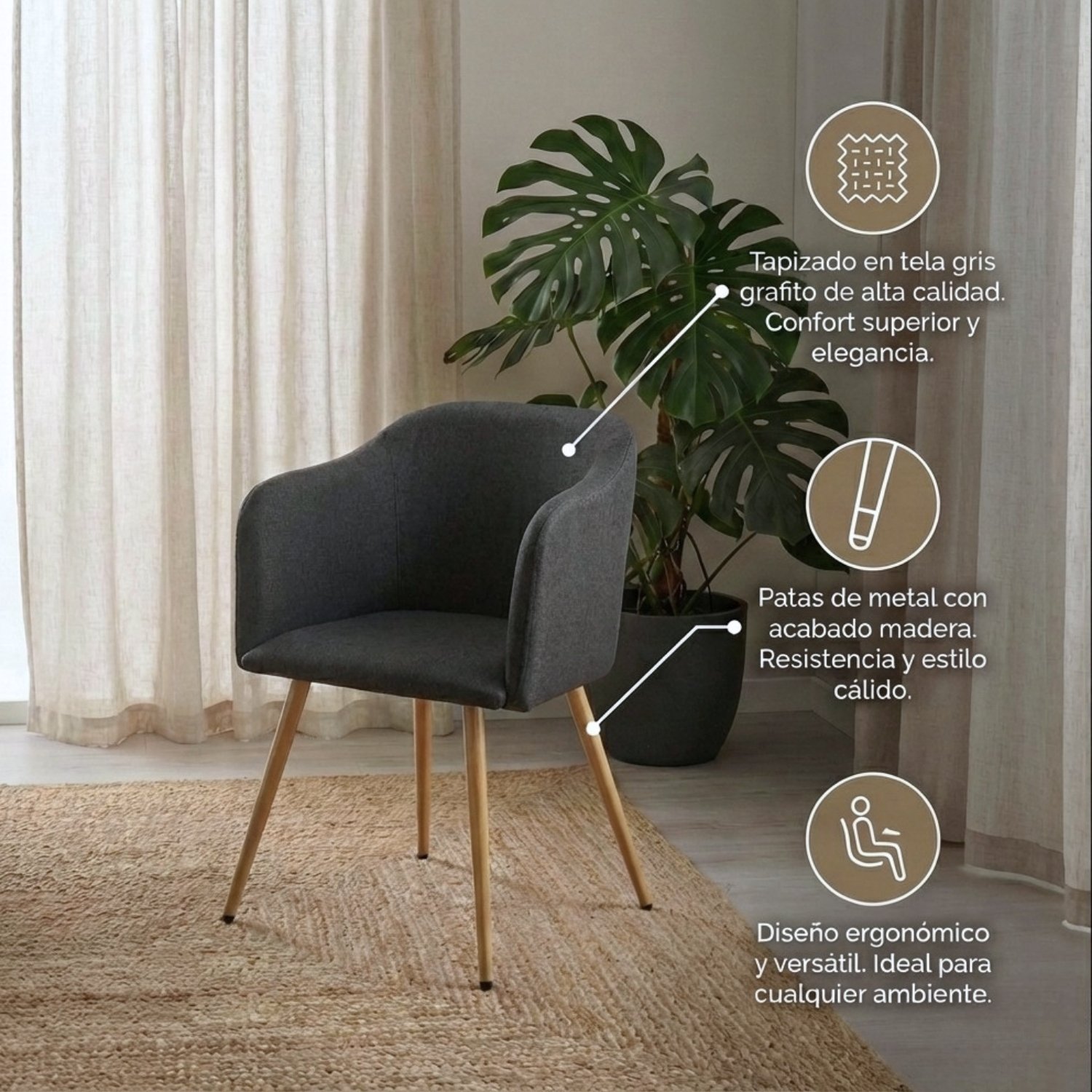 • Sillas (x4): Diseño curvo, tapizado textil gris oscuro. Patas en madera con acabado natural.