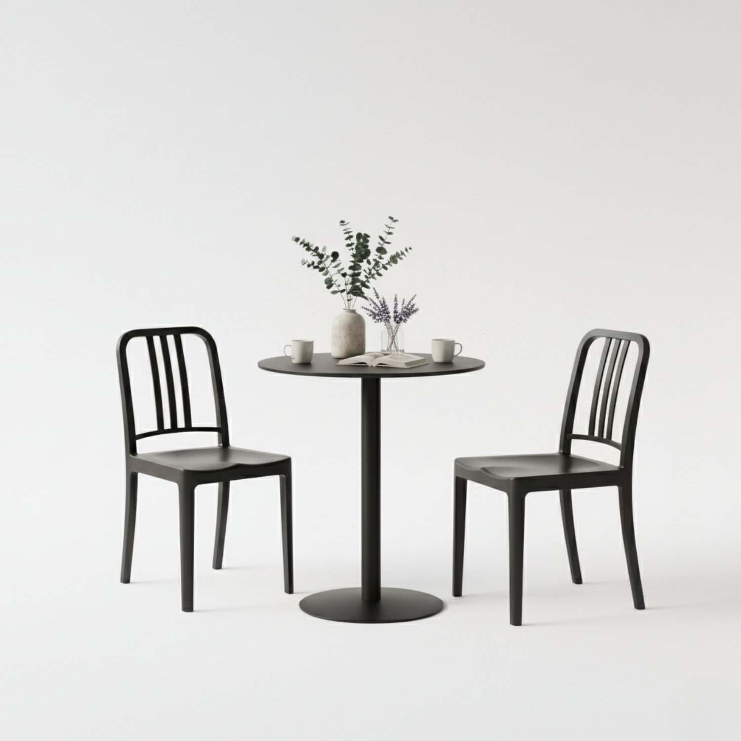 - Configuración: 1 Mesa Redonda de Pedestal + 2 Sillas de Diseño.
