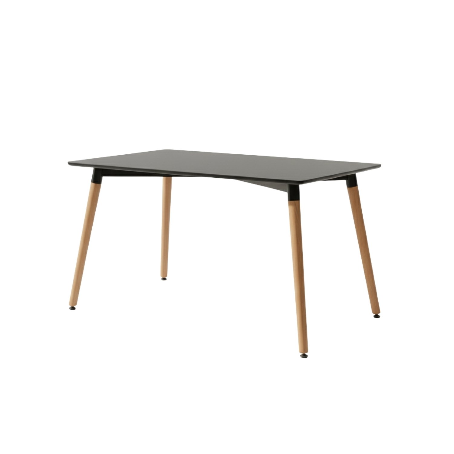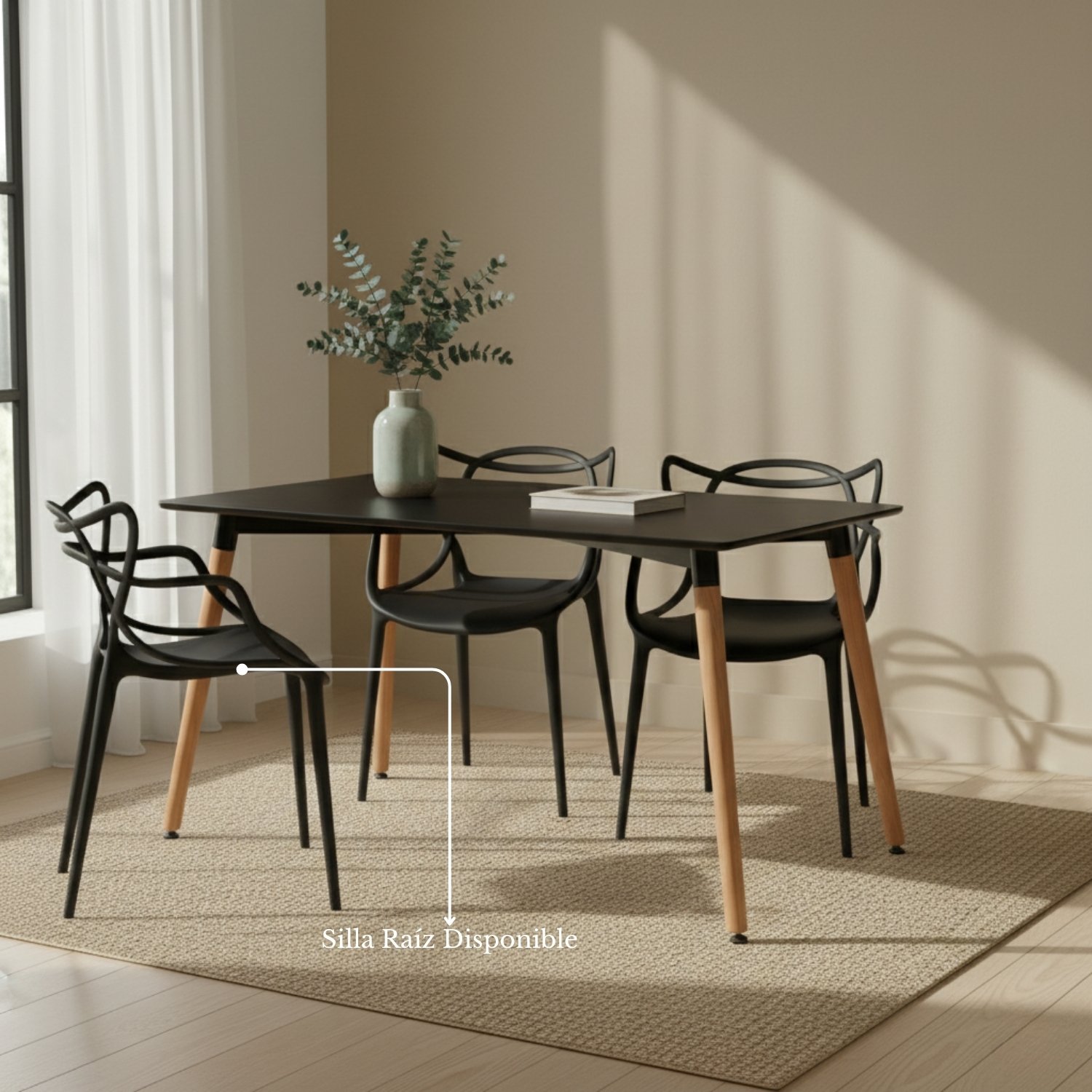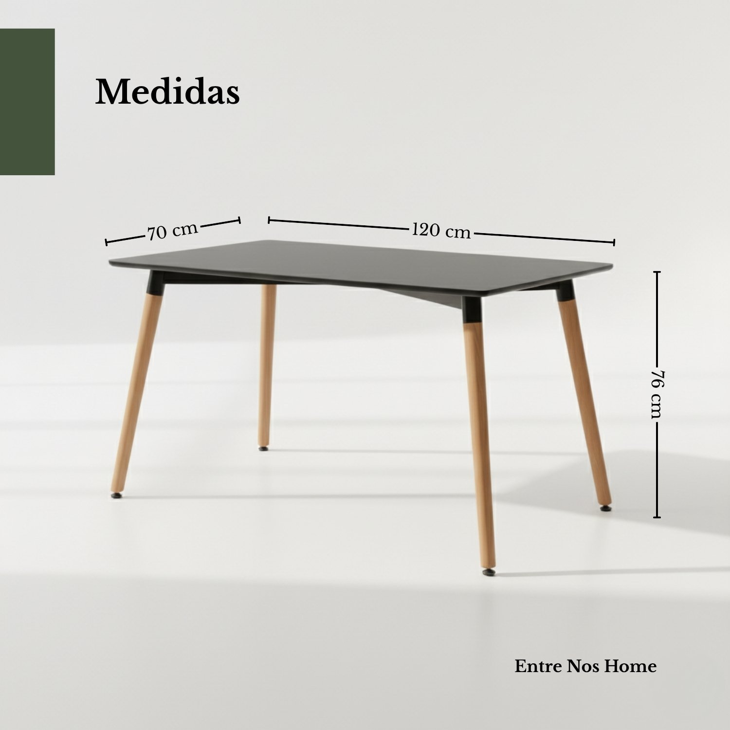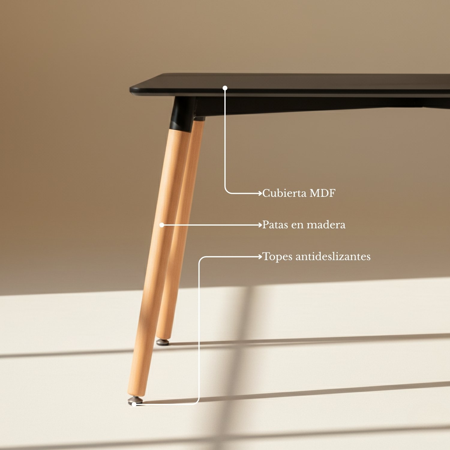 Mesa Luna rectangular negra mate con patas de madera clara. Diseño Nórdico/Mid-Century Modern, resistente y fácil de limpiar. Ideal para tu comedor.