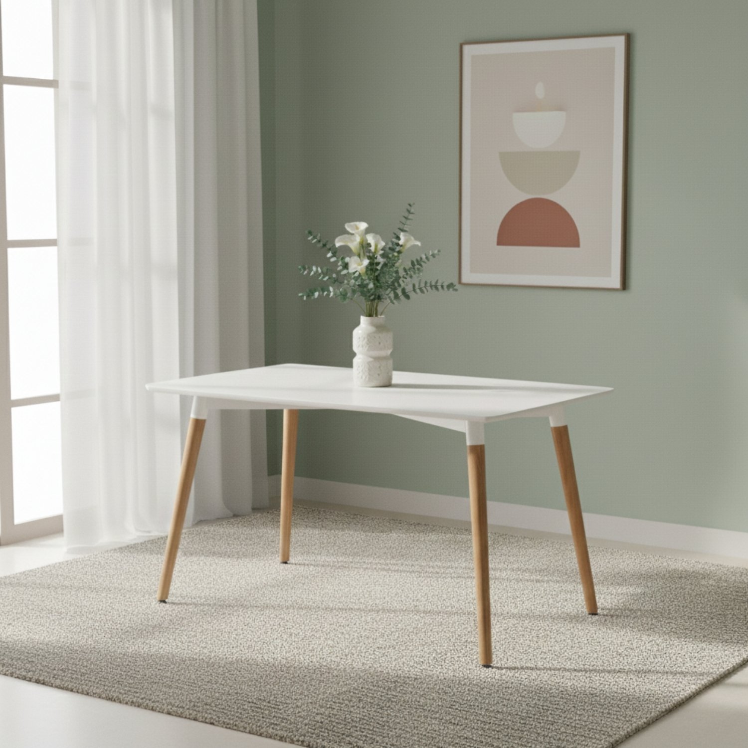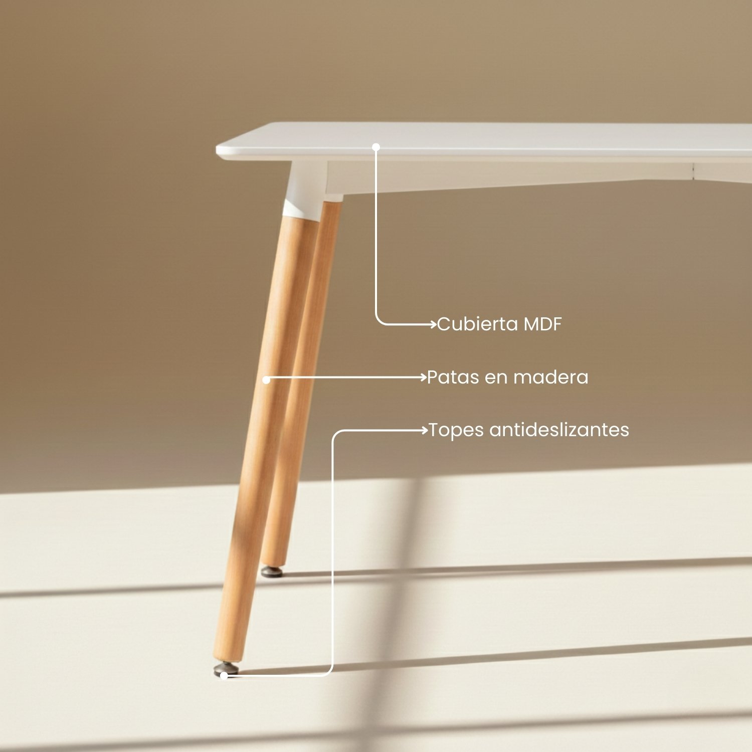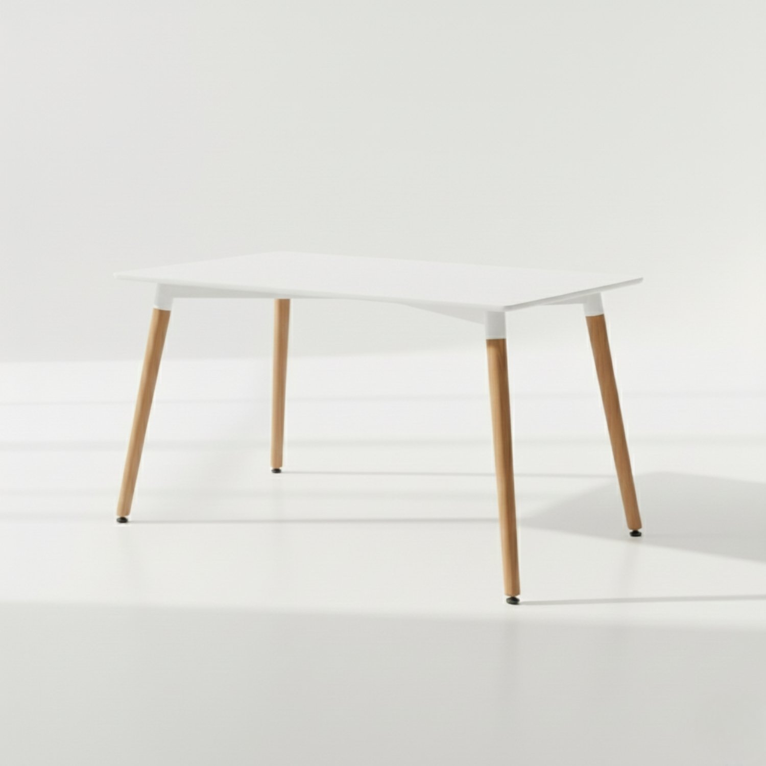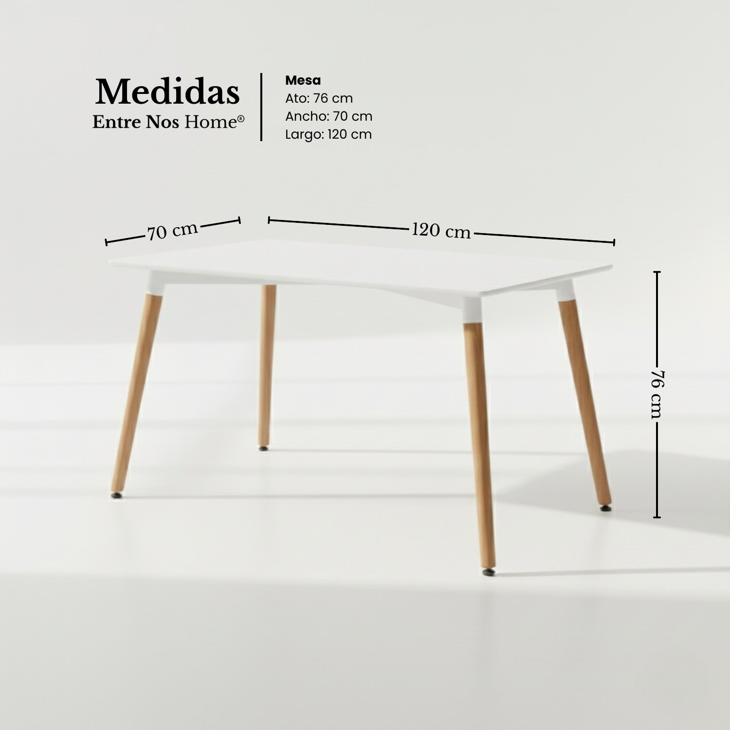 Su diseño ha sido optimizado para la vida urbana contemporánea, ofreciendo una superficie de 120 cm de largo que equilibra perfectamente el área de uso con la fluidez de circulación. La combinación de la cubierta blanca con las patas de madera de arce inyecta la calidez orgánica necesaria para lograr ese estilo “lived-in” y sofisticado, asegurando que tu comedor se sienta aireado, moderno y profundamente acogedor.