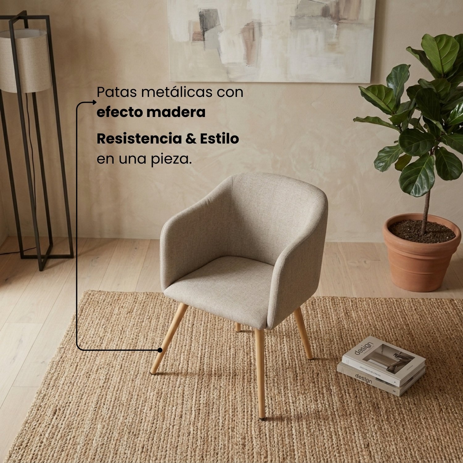 Cada pieza ha sido fabricada bajo un concepto de ingeniería híbrida: una base metálica de alta resistencia con un impecable recubrimiento efecto madera en sus patas. Esta combinación permite disfrutar de la calidez visual de los materiales naturales con la firmeza y durabilidad incondicional del acero. Es una inversión consciente en confort “lived-in”, pensada para acompañar momentos reales de convivencia en un entorno de diseño superior.