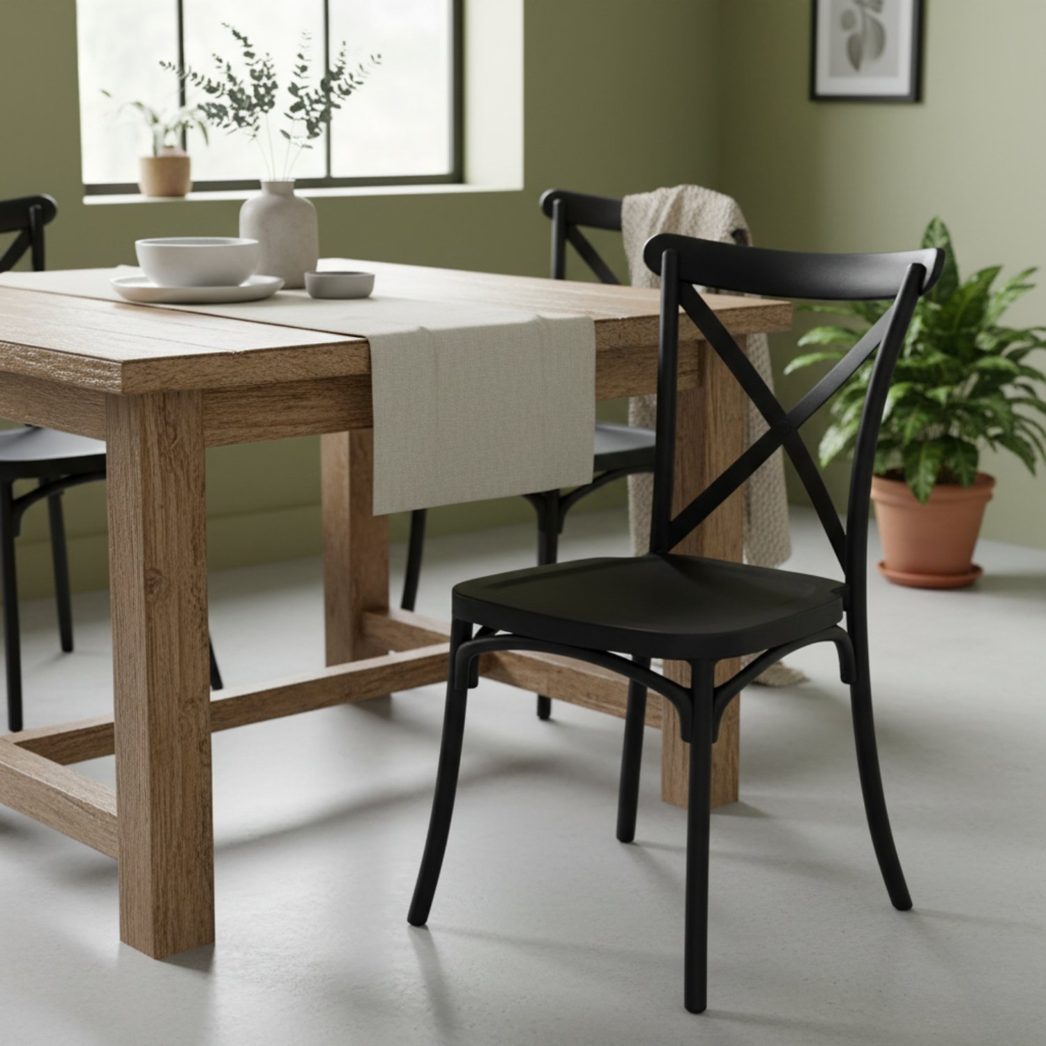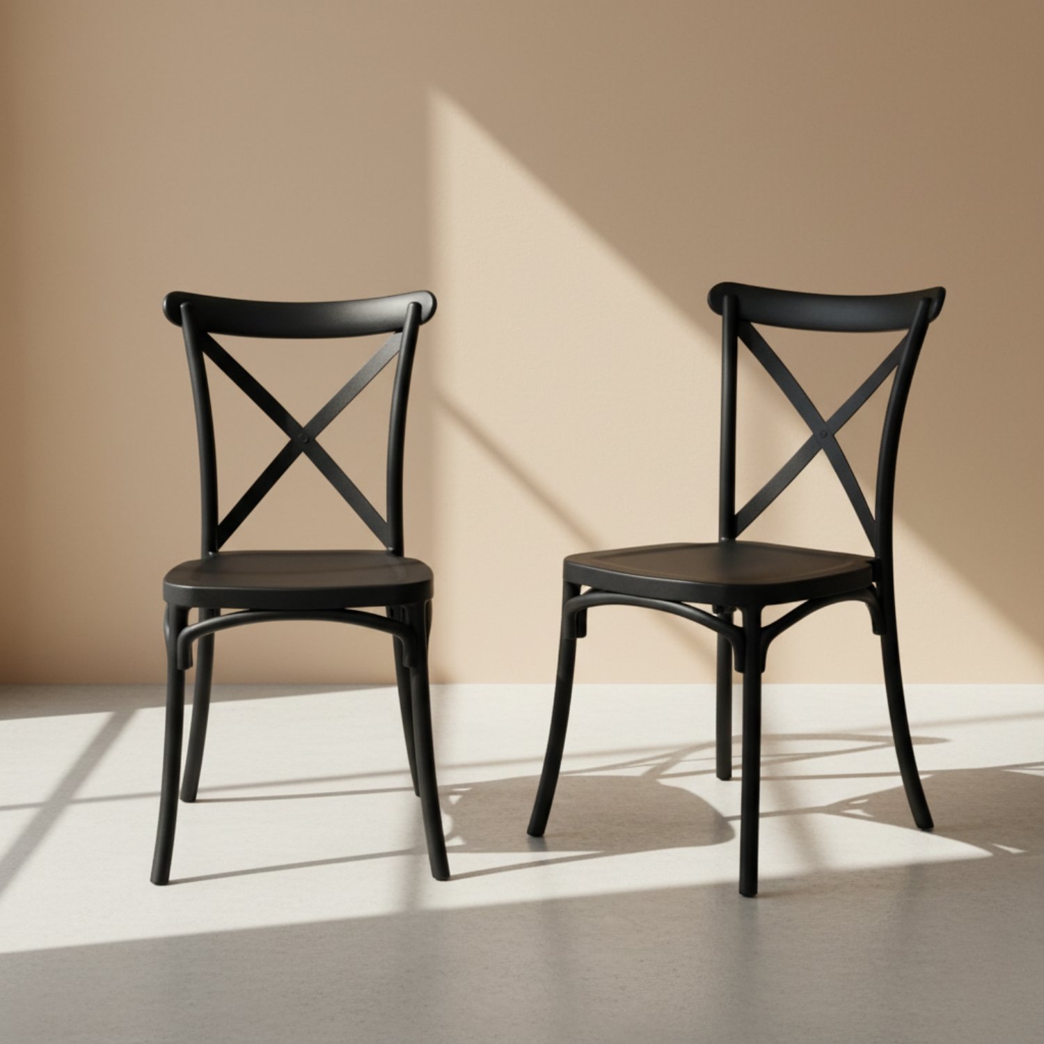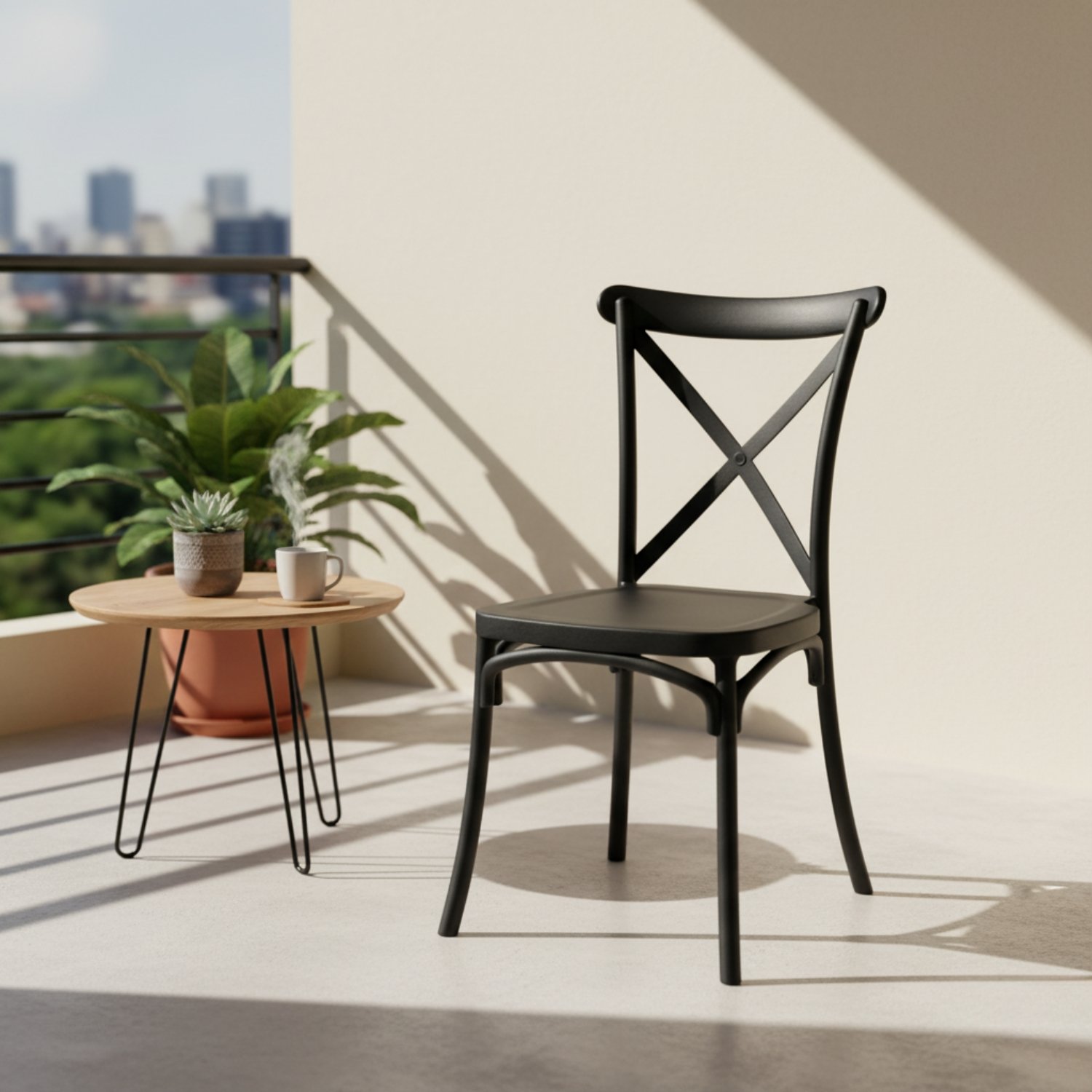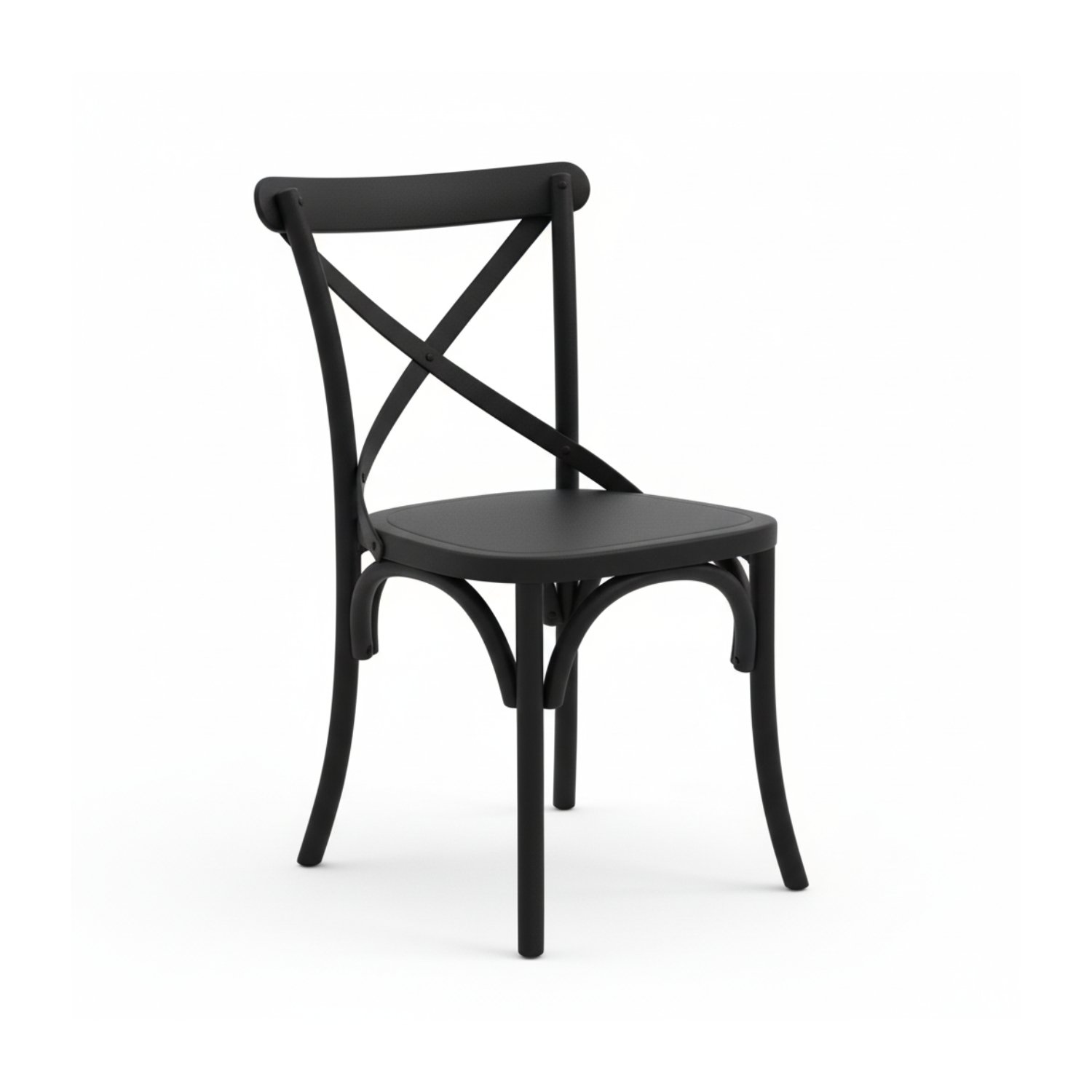 La **Silla Brisa Negra** es un clásico del diseño que trae el encanto rústico y acogedor de un bistró francés o una panadería boutique a tu propio hogar. Su icónico respaldo en forma de aspa (cross-back) y sus curvas delicadas la convierten en una pieza que perdura en el tiempo y combina con múltiples estilos. [cite_start]Queremos **acompañarte** a crear ese hogar cálido [cite: 508] [cite_start]y presentable que te da **confianza para recibir visitas**[cite: 43].
