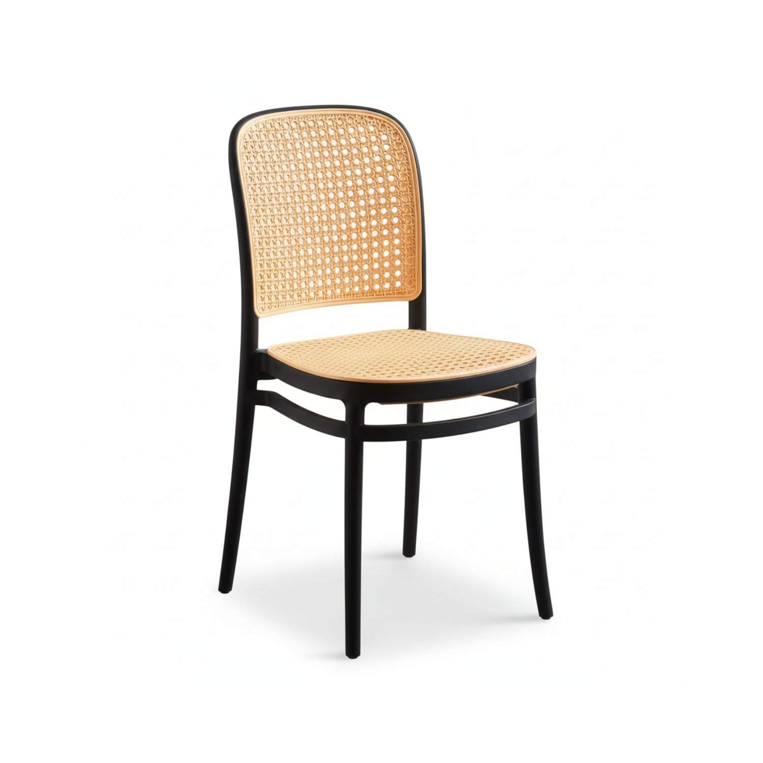 - Materiales: Estructura y patas en color negro, respaldo y asiento en tejido de ratán natural (rejilla).